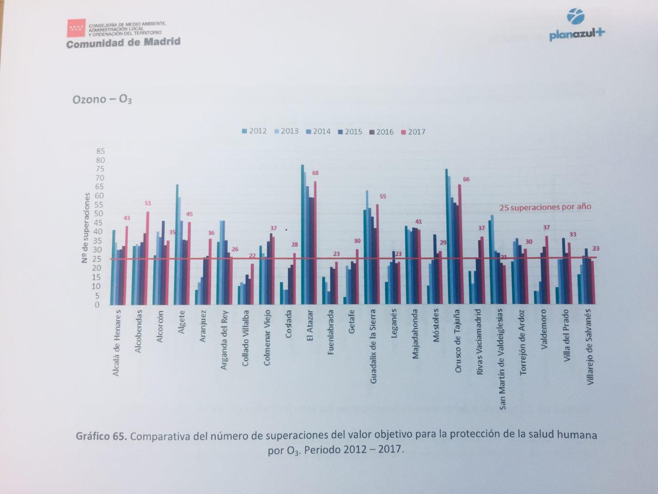 Concretamente, en materia de ozono, 18 de las 23 estaciones de la red autonómica presentaron en 2017 más de 25 superaciones del valor objetivo para la protección de la salud humana. Eso son el 78% de las estaciones autonómicas, mientras en Madrid capital fueron 8 sobre 14, el 57%. El Atazar y Orusco de Tajuña son paradójicamente los municipios más afectados de los 23 que cuentan con medidores.