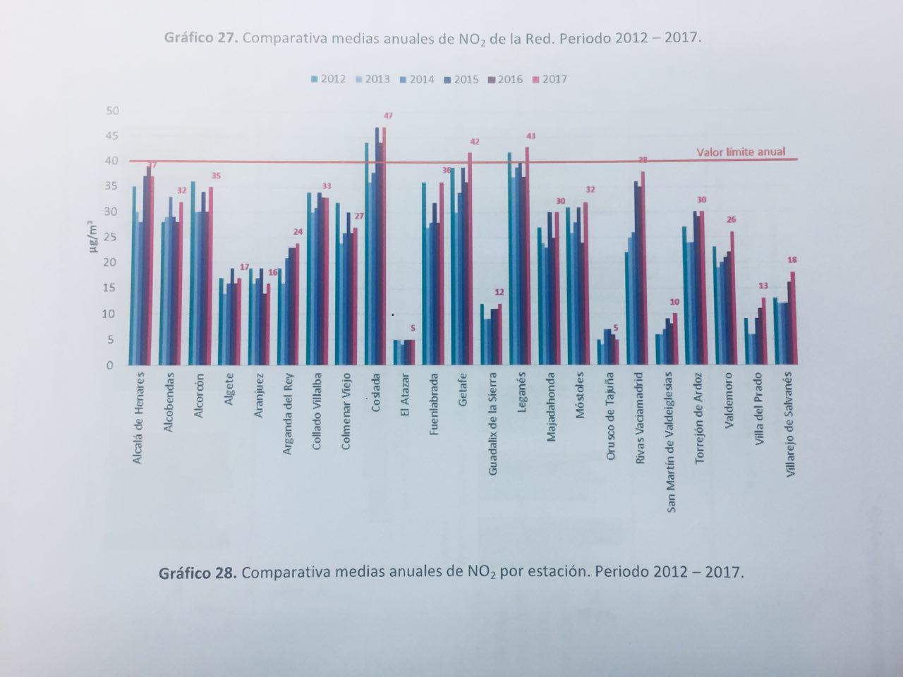 En materia de NO2, en 2017 la situación empeoró en toda la Comunidad, siendo Coslada, Getafe y Leganés las ciudades más afectadas (aparte de Madrid). Y con Fuenlabrada, Alcalá y Rivas muy cerca de los umbrales permitidos. En 2016 sólo Coslada superó los niveles de NO2, así que el empeoramiento a nivel regional es evidente y desmiente rotundamente las mentiras de los señores Izquierdo y Garrido.